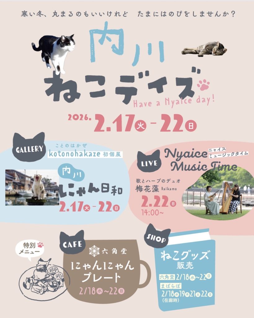 今年から月ごとに楽しいテーマの1週間を設けるとのことで、2月22日をニャン・ニャンニャンの日🐱🐾として、猫がテーマの1週間です。ライブだけではなく、ねこ写真家の「ことのはかぜ」さんの個展や、猫にちなんだメニューや本、猫グッズの販売もあるので猫好きさんはお見逃しなく。猫とともに春の日差しを待つ、ほっこり、のび~~っとティータイムをぜひお楽しみください😸